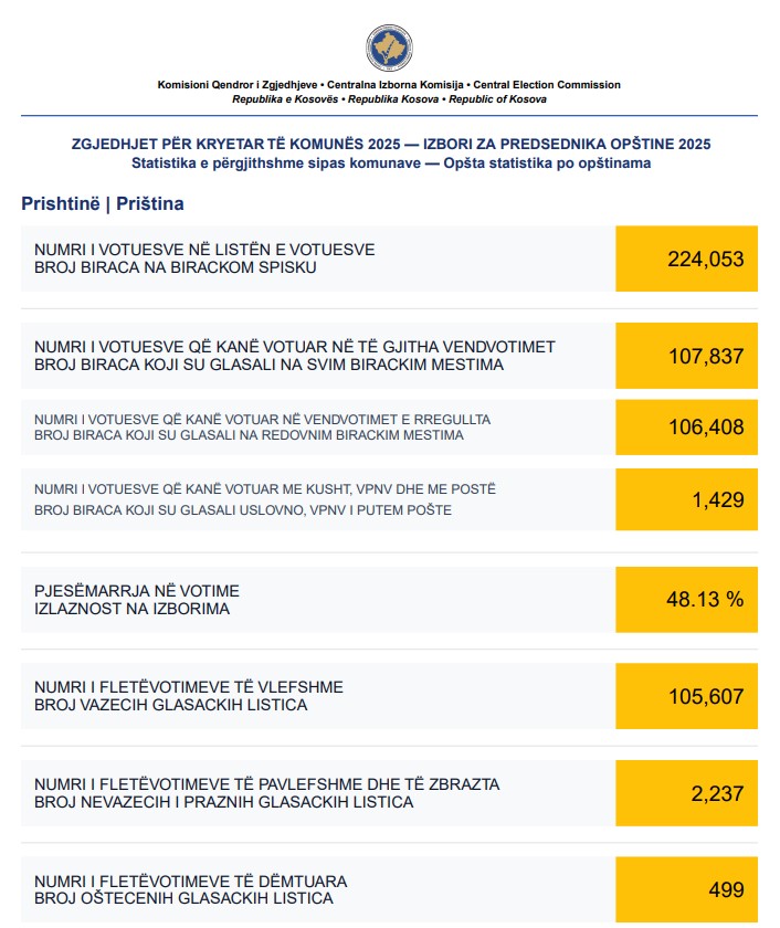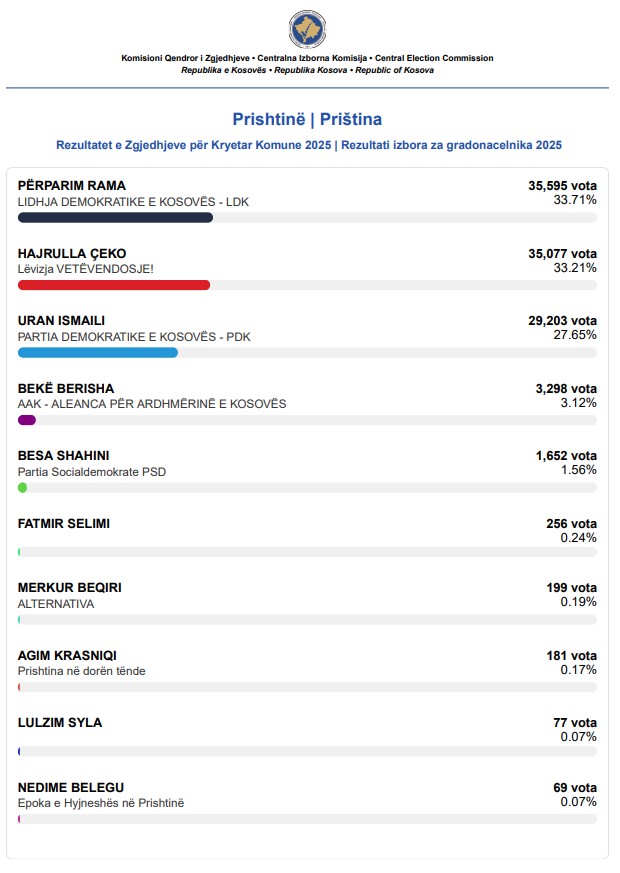 Sipas rezultateve të publikuara nga KQZ, Përparim Rama ka marrë 165 vota ose 34.59%, ndërsa Hajrulla Çeku 140 vota ose 29.35%. Pas tyre renditet kandidati i PDK-së, Uran Ismaili, me 18 vota ose 29.14%, ndërsa Bekë Berisha i AAK-së ka marrë po ashtu 18 vota ose 3.77%. Kandidatja e PSD-së, Besa Shahini, ka siguruar 11 vota ose 2.31%, dhe Agim Prishtina nga nisma “Prishtina në dorën tënde” ka marrë 3 vota ose 0.63%.
