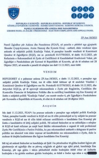 “Refuzohet ankesa e subjektit politik Koalicioni Vakat… dhe konfirmohet vendimi i Komisionit Qendror të Zgjedhjeve për moscertifikimin e kandidates Ena Krasniqi”, thuhet ndër të tjera në aktvendimin e PZAP-it.