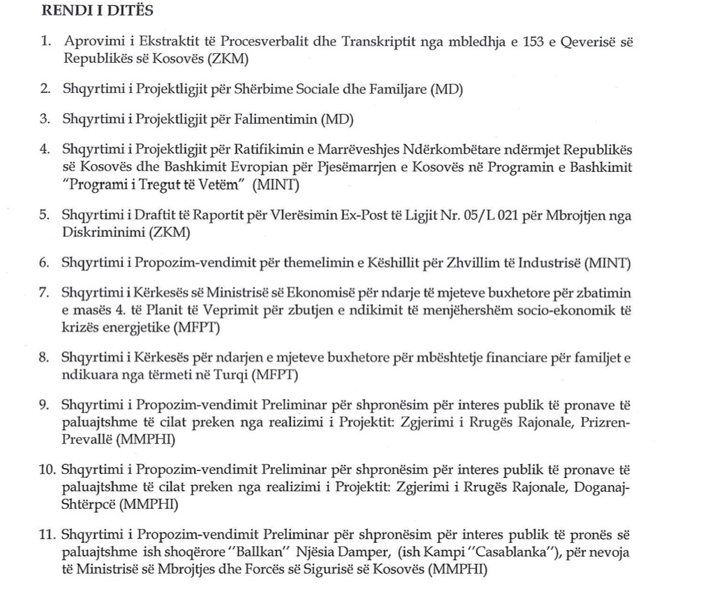 Po ashtu, në rend dite do të jetë Shqyrtimi i Draftit të Raportit për Vlerësimin Ex-Post për Mbrojtjen nga Diskriminimi dhe Shqyrtimi i propozim-vendimit për themelimin e Këshillit për Zhvillim të Industrisë.