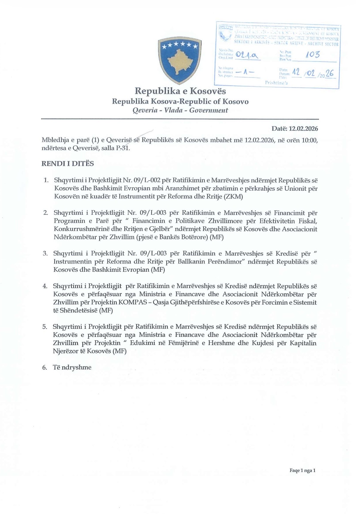 Pika e parë ka të bëjë me shqyrtimin e Projektligjit për ratifikimin e Marrëveshjes ndërmjet Kosovës dhe BE-së për aranzhimet e zbatimit dhe përkrahjes së Unionit për Kosovën në kuadër të Instrumentit për Reforma dhe Rritje (ZKM).