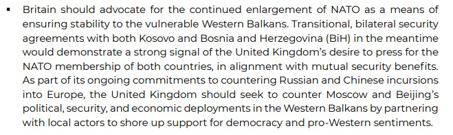 Raporti gjithashtu rekomandon që Britania të nënshkruajë marrëveshje sigurie bilaterale me Kosovën dhe Bosnjën e Hercegovinën, si sinjal i qartë për mbështetjen e anëtarësimit të tyre të ardhshëm në NATO.