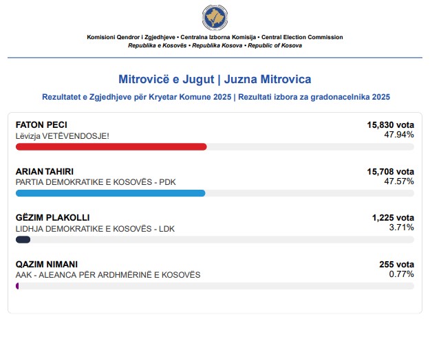 Në Mitrovicën e Jugut sot, më 9 nëntor, qytetarët po votojnë në raundin e dytë të zgjedhjeve për kryetar komune, ku përballen Faton Peci nga Lëvizja Vetëvendosje dhe Arian Tahiri nga Partia Demokratike e Kosovës (PDK).