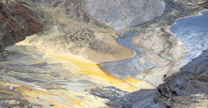 Dy minatorë duke ecur nëpër një minierë të hapur bakri në qytetin serb, Bor, 8 qershor 2013.