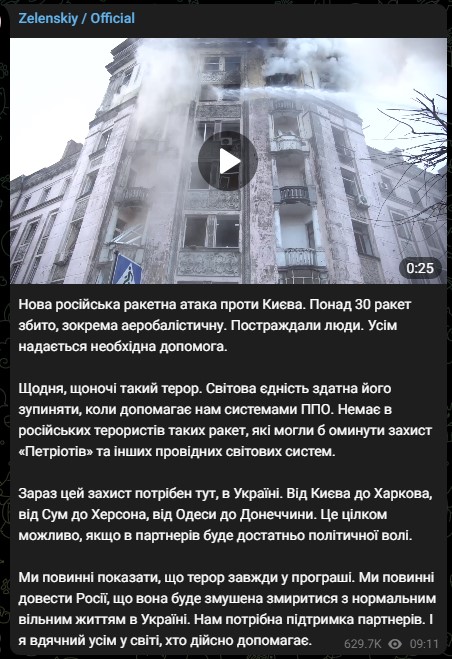 “Çdo ditë dhe çdo natë ka një terror të tillë. Uniteti i botës mund ta ndalojë atë kur na ndihmon me sistemet e mbrojtjes ajrore. Tani ne kemi nevojë për këtë mbrojtje këtu në Ukrainë,” tha Presidenti Volodymyr Zelenskiy në aplikacionin e mesazheve Telegram.