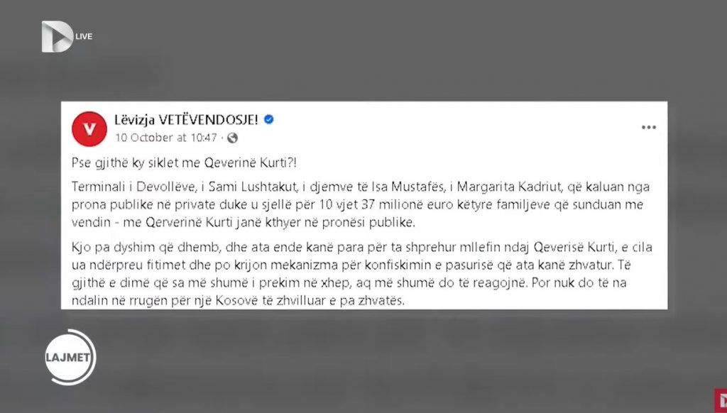 “Terminali i Devollëve, i Sami Lushtakut, i djemve të Isa Mustafës, i Margarita Kadriut, që kaluan nga prona publike në private duke u sjellë për 10 vjet 37 milionë euro këtyre familjeve që sunduan me vendin, me Qeverinë Kurti janë kthyer në pronësi publike”, thuhet në postimin e Lëvizjes Vetëvendosje.