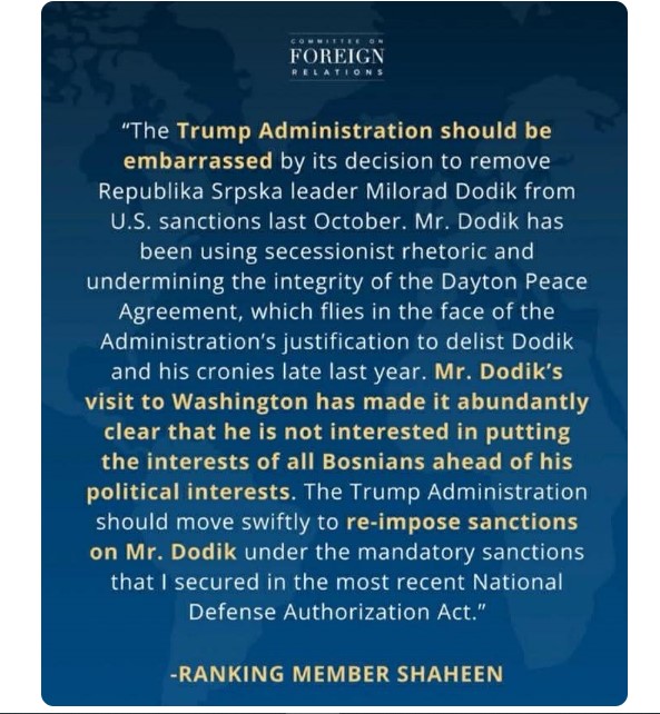 “Administrata e Donald Trump duhet të turpërohet për vendimin e saj për të hequr sanksionet e SHBA-së tetorin e kaluar ndaj (ish-liderit të Republika Srpska, Milorad Dodik. Z. Dodik përdor retorikë separatiste dhe minon integritetin e Marrëveshjes së Paqes së Daytonit, gjë që është në kundërshtim të plotë me justifikimin e Administratës për heqjen e Dodik dhe bashkëpunëtorëve të tij nga lista e sanksioneve në fund të vitit të kaluar”, deklaroi senatorja Shaheen.