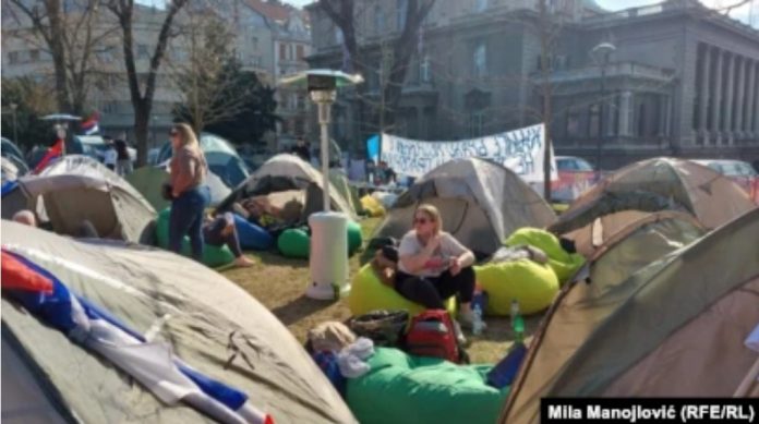 “Kemi ardhur nga Kosova. Vullnetarisht. Askush nuk na organizoi”, thotë për Radion Evropa e Lirë një nga të mbledhurit në Parkun e Pionierit në Beograd, ku është ngritur një kamp i studentëve, që kundërshtojnë bllokadat e fakulteteve.