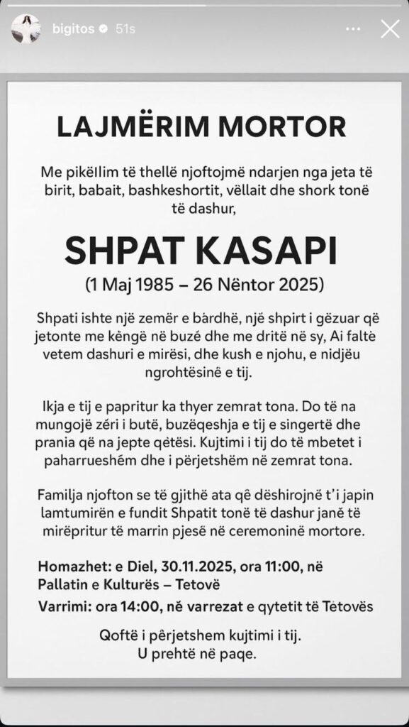 Shpat Kasapi, këngëtari i njohur shqiptar që u nda papritur nga jeta në moshën 40-vjeçare, do të varroset nesër në Tetovë.