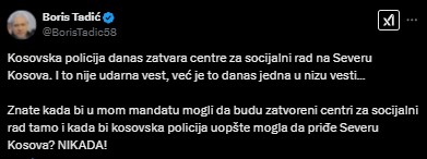 Ish-presidenti i Serbisë, Boris Tadiq, ka shkruar për aksionin e fundit të institucioneve të sigurisë së Kosovës në Veri që ka rezultuar me mbylljen e disa qendrave sociale paralele në Veri.