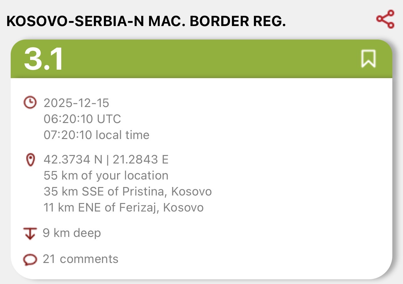 Një tërmet me magnitudë 3.1 ballë të shkallës Rihter është regjistruar sot në mëngjes në rajonin kufitar mes Kosovës, Serbisë dhe Maqedonisë së Veriut.