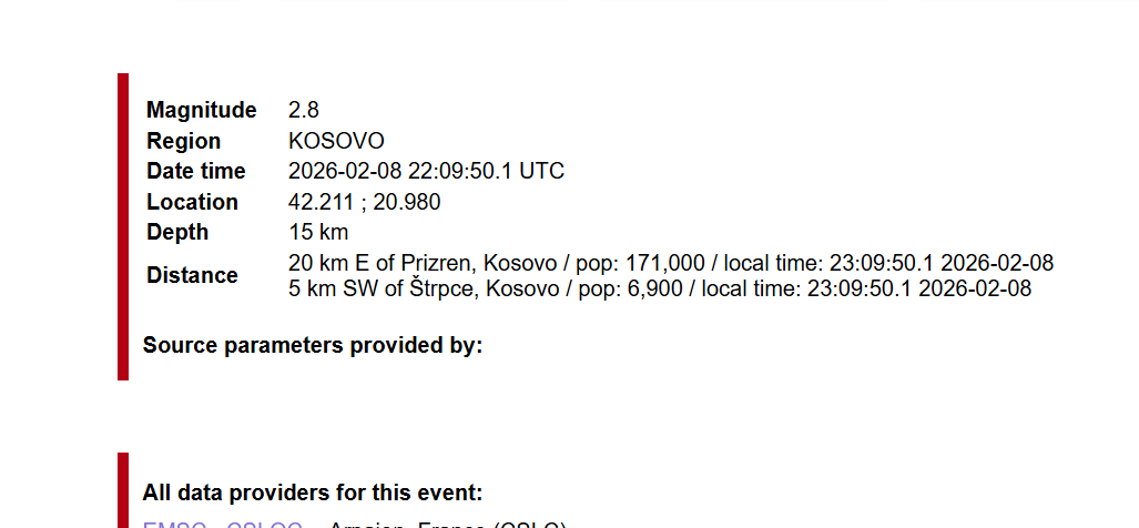 Sipas të dhënave nga EMSC, epiqendra e tërmetit ishte rreth 15 kilometra në lindje të Prizrenit, ndërsa thellësia e lëkundjes ishte 5 kilometra.