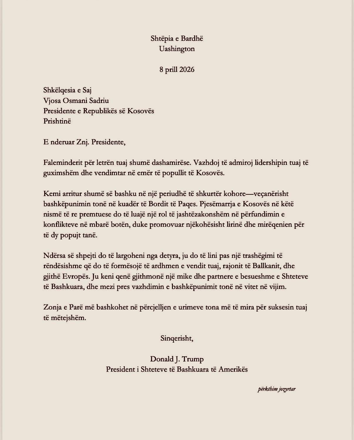 Në letrën e tij, Trump shpreh mirënjohje për bashkëpunimin e deritanishëm dhe thekson se pret forcimin e mëtejshëm të marrëdhënieve në vitet në vijim.