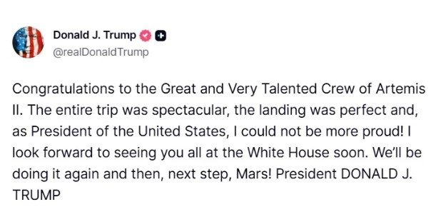 “Urime ekuipazhit të madh dhe shumë të talentuar të Artemis II. I gjithë udhëtimi ishte spektakolar, ulja ishte perfekte dhe, si President i Shteteve të Bashkuara, nuk mund të jem më krenar!”, ka shkruar Trump në një postim në Truth Social.