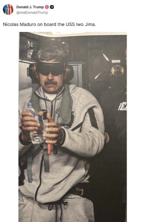 Donald Trump ka ndarë së fundmi një imazh të Nicolas Maduro, ku lideri venezuelian shfaqet i arrestuar dhe nën mbikëqyrje, duke nxitur reagime të forta ndërkombëtare.
