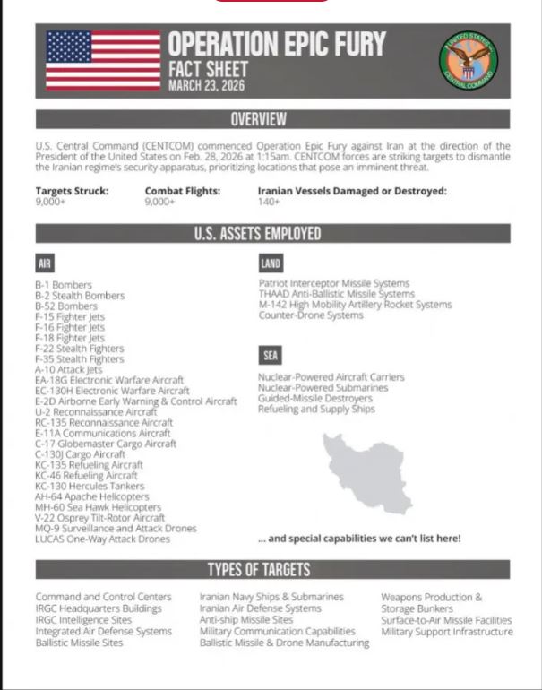 Komanda Qendrore e SHBA-së (CENTCOM) ka bërë të ditur se ka goditur mbi 9,000 objektiva në Iran dhe ka dëmtuar ose shkatërruar 140 mjete lundruese iraniane që nga nisja e luftës SHBA-Izrael më 28 shkurt.