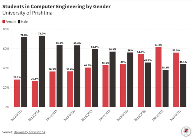 “Për shembull, në vitin akademik 2012/2013, në Departamentin e Inxhinierisë Kompjuterike, vetëm 28.2% kanë qenë femra dhe, një vit më pas, më 2013/2014, kjo përqindje ka qenë edhe më e ulët, përkatësisht 26.8%.”