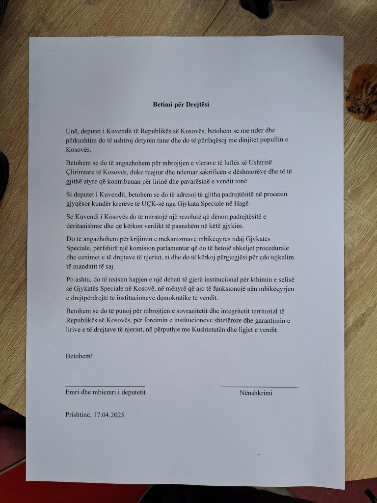 “Shpresojmë që deputetët do ta nënshkruajnë këtë betim simbolik si një zotim moral për të adresuar padrejtësitë ndaj krerëve të UÇK-së dhe ushtarëve të tjerë që po gjykohen padrejtësisht në Hagë”.