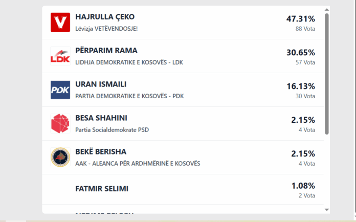 Nga 20 për qind e votave të numëruara, prin kandidati i Vetëvendosjes Hajrulla Çeku me 47.31 për qind ose 88 vota.