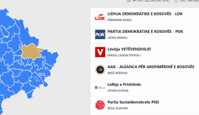 Pas numërimit të 84% të votave në Prishtinë, Lëvizja Vetëvendosje (LVV) ka rënë në vend të tretë në garën për Asamblenë Komunale, ndërsa Lidhja Demokratike e Kosovës (LDK) kryeson me 28.89% të votave.