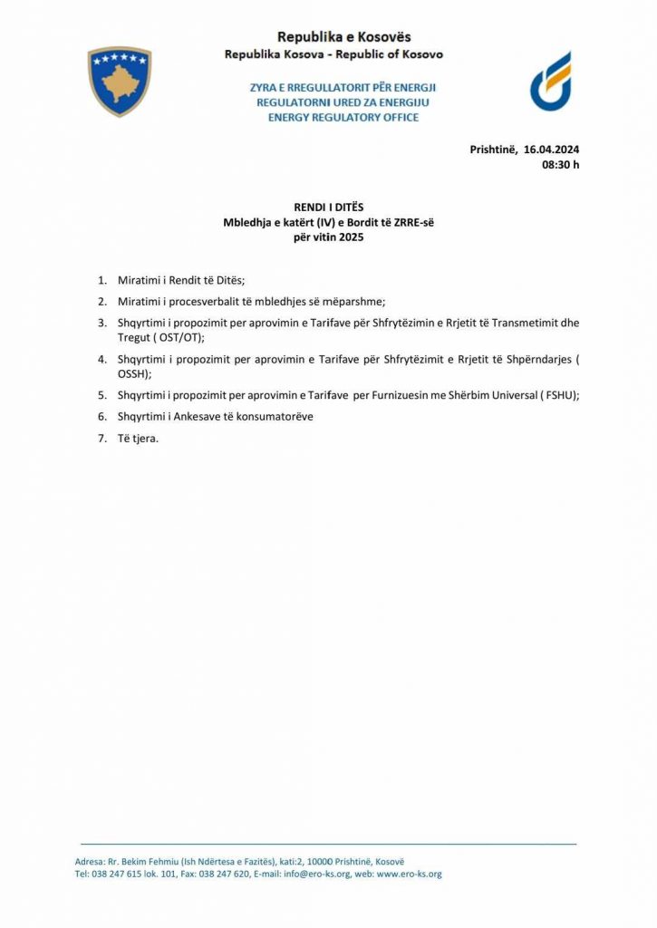 Mbledhja është thirrur për në orën 08:30 dhe përfshin në rend dite disa pika kyçe që lidhen me miratimin e tarifave për kompanitë energjetike KOSTT, KEDS dhe KESCO.